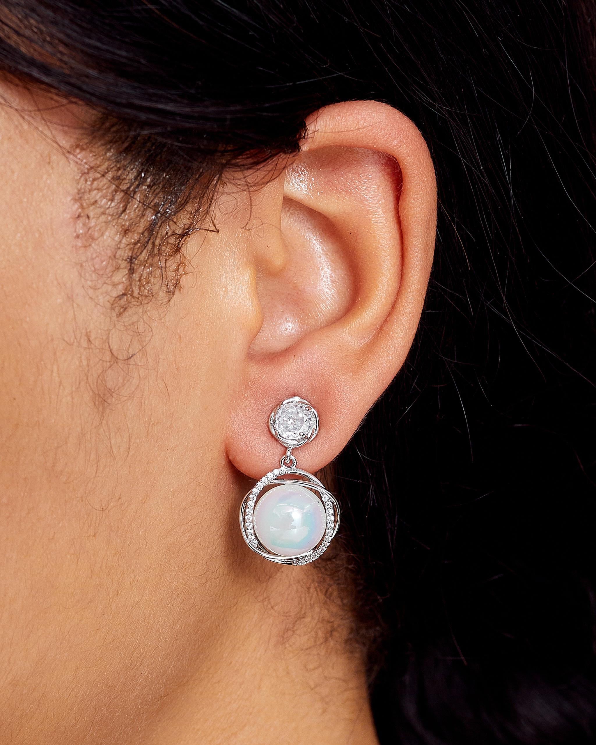 The Opal Orbs Earrings feature a luminous pearl accent paired with sleek orb detailing, creating a timeless blend of elegance and modern charm